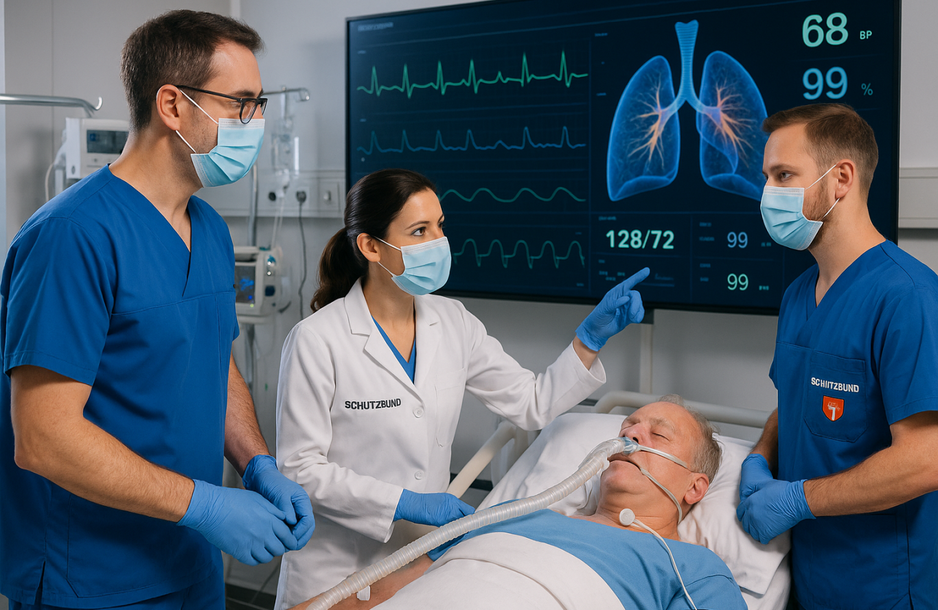 + Infusionssysteme + EKG kleben/ 3-Kanal lesen + Beatmungsbeutel + BZ + SpO₂ + RR + AER